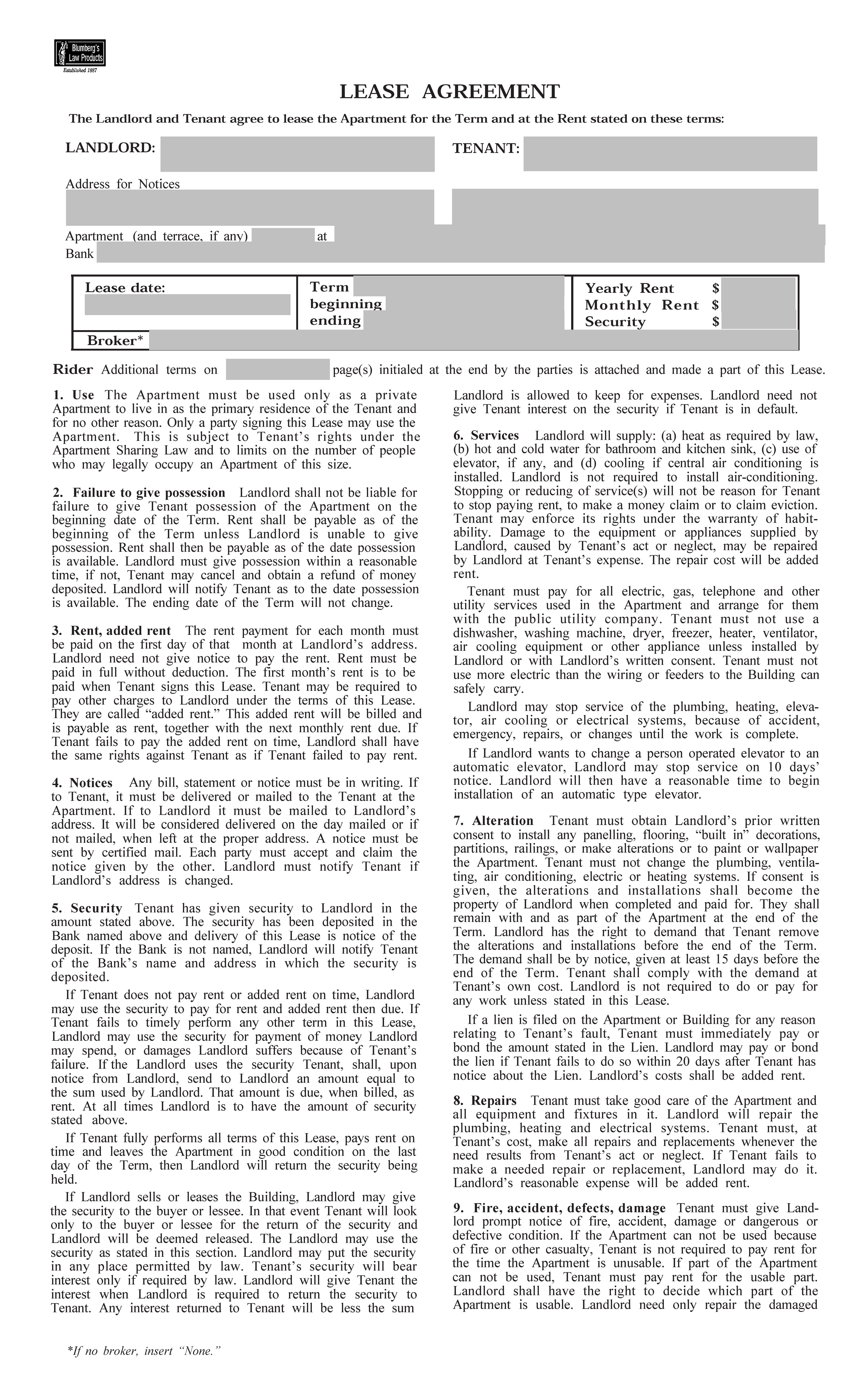 Blumberg Law Forms Catalog. New york real estate board lease agreement. The most secure digital platform to get legally binding, electronically signed documents in just a few seconds. Fill out, securely sign, print or email your lease agreement blumberg legal forms online instantly with signnow. A lease agreement allows a tenant to live in a space in exchange for consistent payments of rent to the landlord. Available for pc, ios and android. New york lease agreement forms. Sign, fax and printable from pc, ipad, tablet or mobile with pdffiller instantly. Pdf doc xls rtf txt ppt. A lease agreement, also called a rental agreement, is a legal contract made between someone who owns and/or manages a property such as an apartment or house, and the person or. Ee preview 202 apartment lease month to month 2004 blumbergexcelsior inc nyc plain english format 1214. 2 pdf lease agreement blumberg legal forms online are you also searching for lease agreement blumberg legal forms online? Start a free trial now to save yourself time and. The operating agreements below in fillable pdf format are included by default with llc kits ordered commercial leases comprehensive office lease, limited good guy guaranty, prepared by arnold mandell, esq. Get it only at our library now. Housing stability and tenant protection act of 2019.